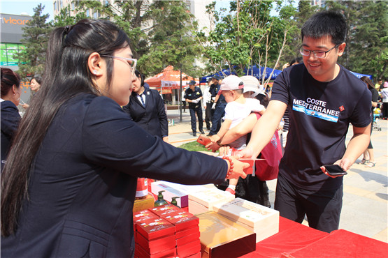 工作人员为业主赠送礼品。